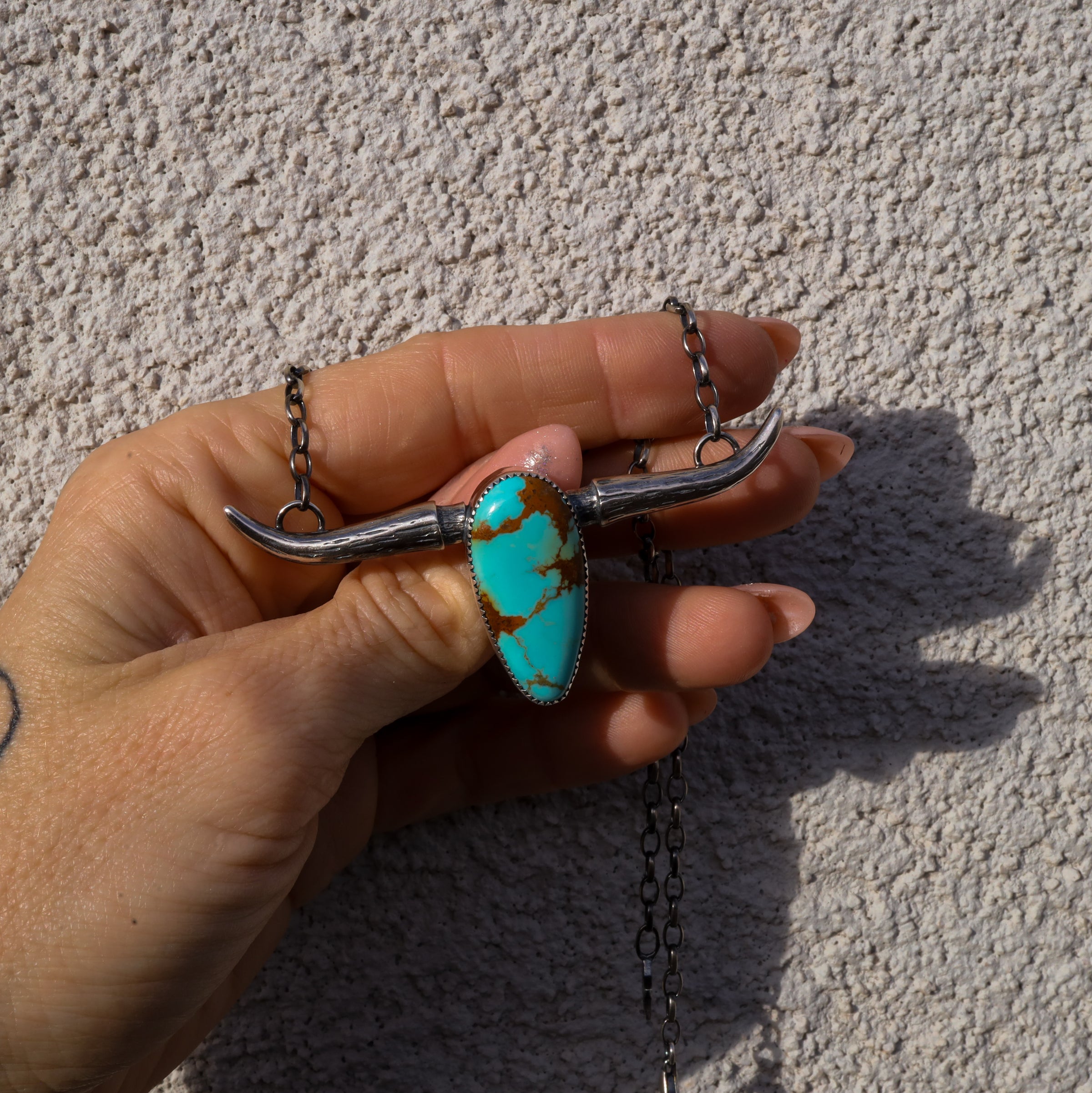 Rooted in western tradition and elevated with refined craftsmanship, the Longhorn Necklace is pure cowboy luxe. Sterling silver longhorns form the centerpiece of this bold design. At the heart of the necklace sits a striking and electric light blue with golden matrix turquoise we sourced at the Tuscon Gem Show 2025, cut to 30mm x 16mm and prized for its vivid color and natural character.